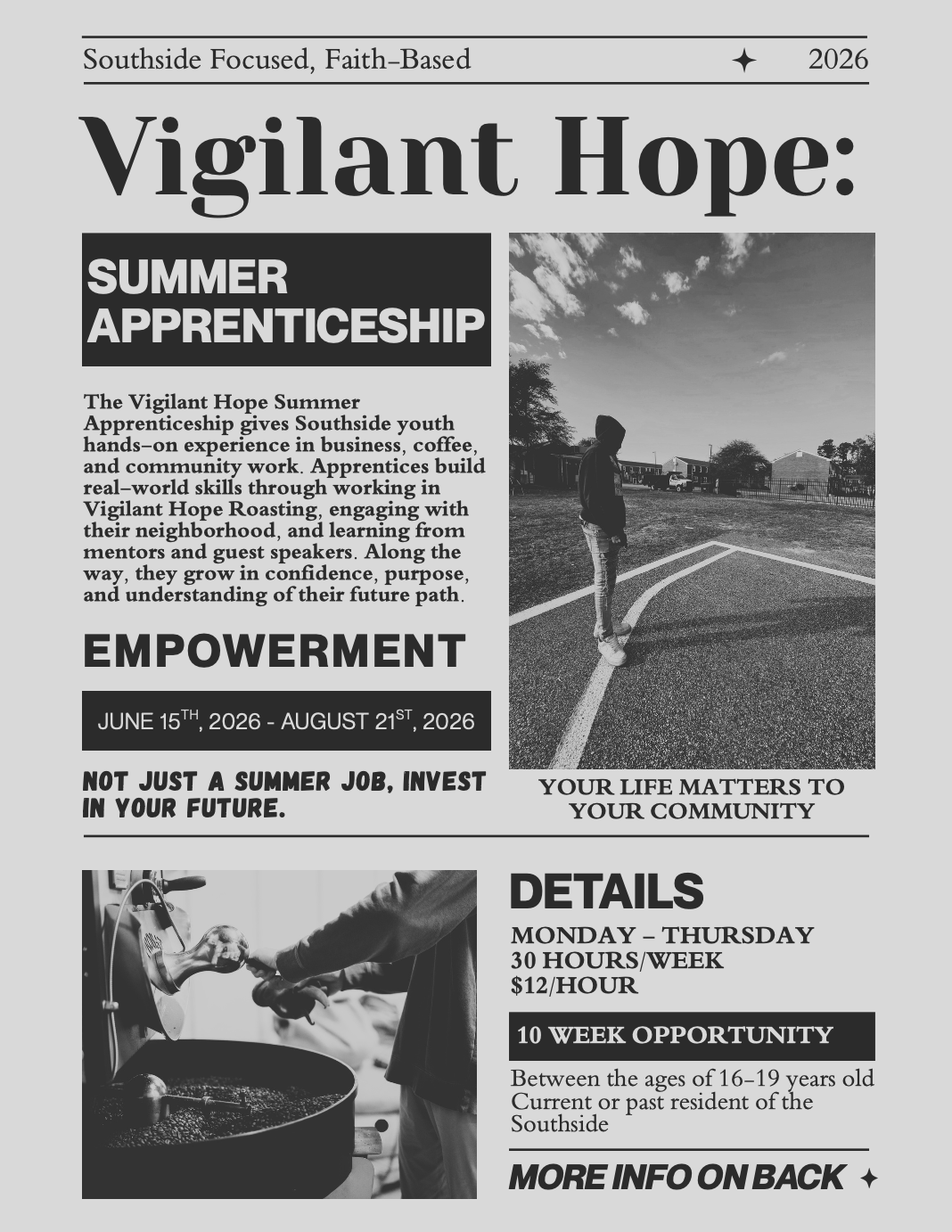 The Vigilant Hope Summer Apprenticeship gives Southside youth hands-on experience in business, coffee, and community work. Apprentices build real-world skills through working in Vigilant Hope Roasting, engaging with their neighborhood, and learning from mentors and guest speakers. Along the way, they grow in confidence, purpose, and understanding of their future path.